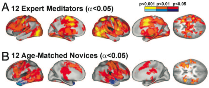 These articles have taken steps to identify and understand physiological differences in well-focused minds compared to lay people, it is analogous to a study showing that professional athletes have more muscle mass, in a manner communicating to those of us who seek to perform better at either a physical sport or become better problem solvers, that the mind, like the body must be trained and shaped to overcome difficult challenges. The papers in these two posts converge in that both studies show meditation increases activity and over long-term practice, cause structural changes in regions associated with focus and concentration.