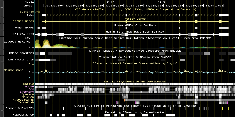 a) Tracks: The bane of academics and government researchers everywhere, sequences represented as rows. Track browsers can display multiple dimensions of the same set of data as well as comparative sets. UCSC Genome Browser is the standard example for this method. However, their usefulness is often limited to close-level, specific targets.